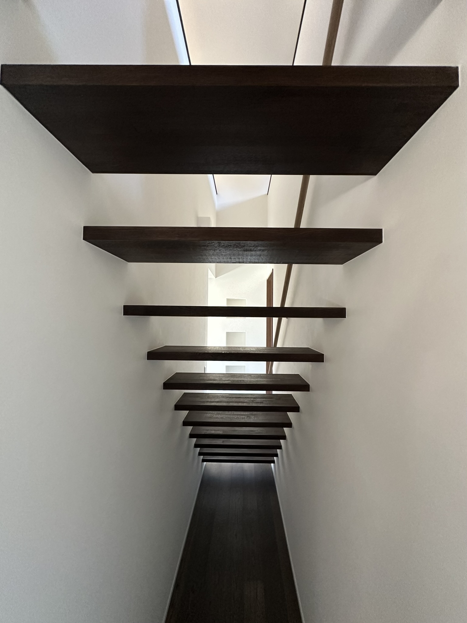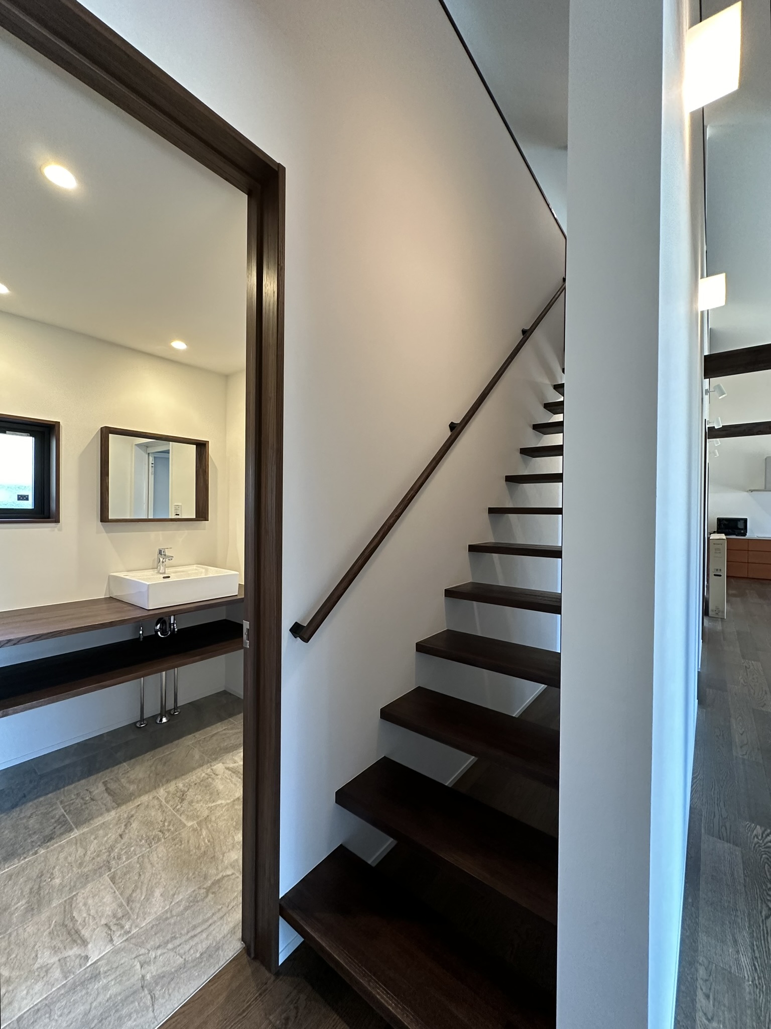 住まわれる方のご理解と、作る方の協力がなければできないことなのですが、蹴込み板の無い段板だけの階段やそれを支える方法も、既製品の階段を使いながら普段の注文建築とほぼ変わらない仕上がりレベルでおさめてくださいました。