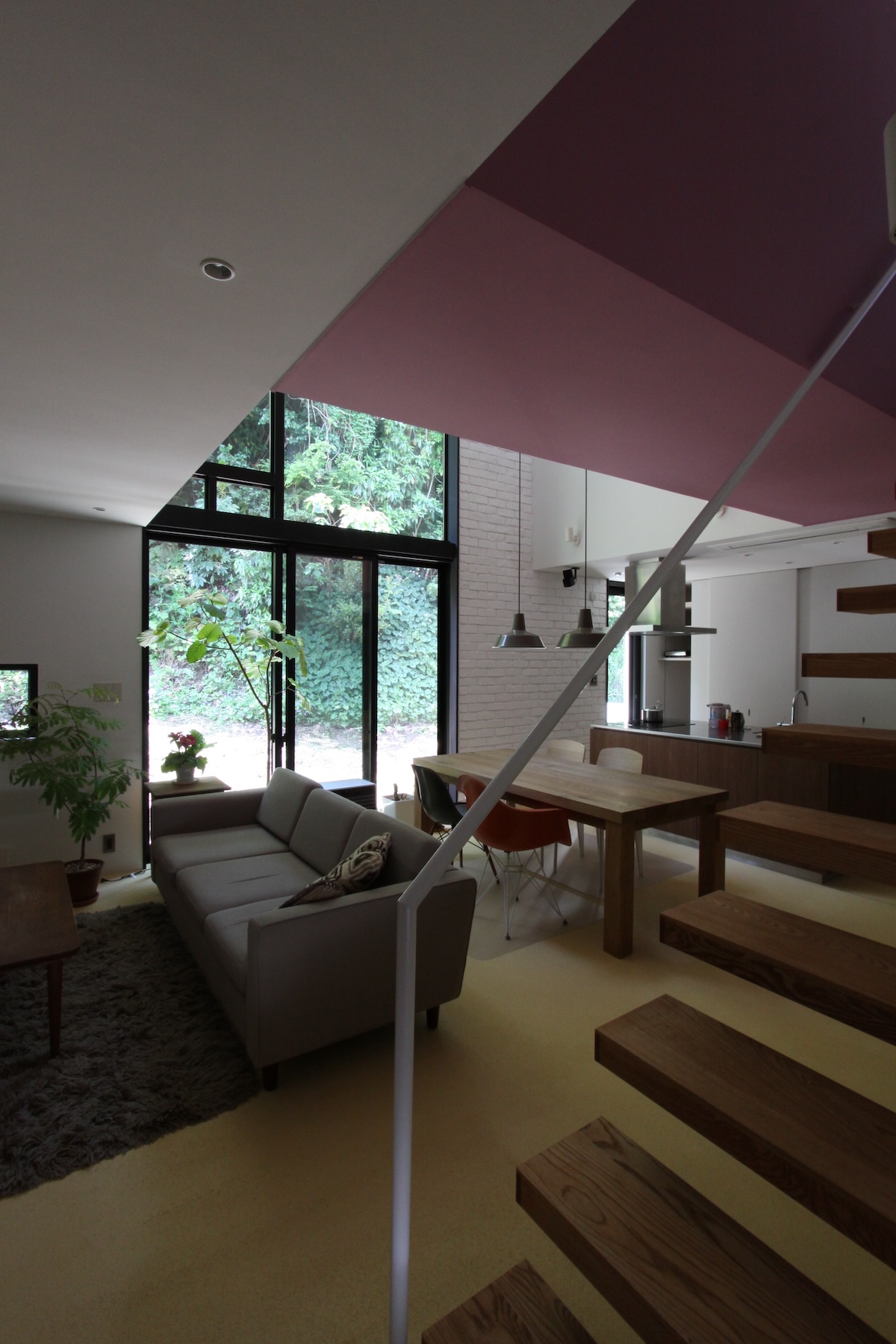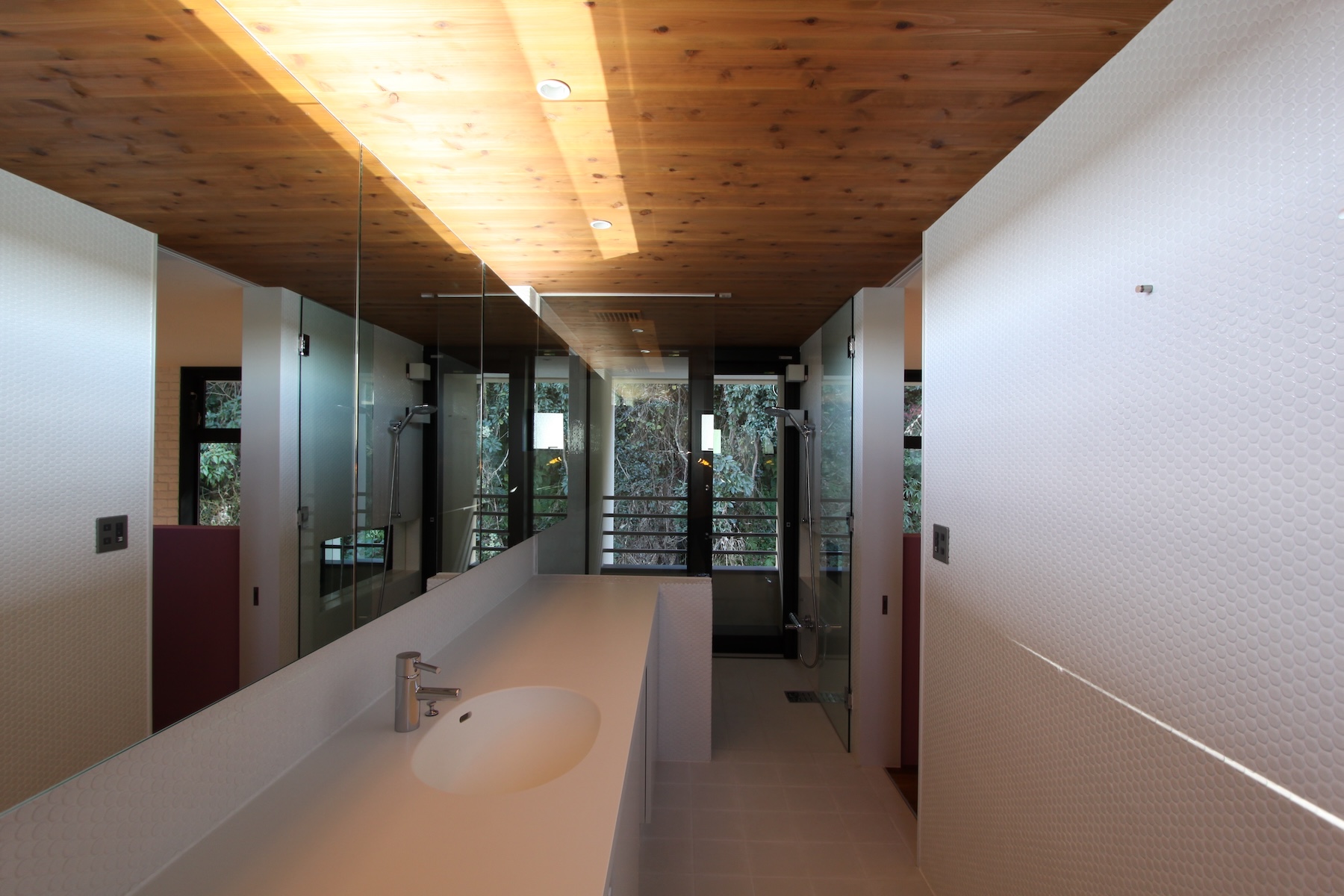 建築事例 崖地の緑を取り込む家 work_07_02work_07_01 崖の安全性を確認した上での話となるが、リビングダイニングの吹抜けに面した窓を緑豊かな崖の斜面に対して開いている。他人が立ち入ることが無い緑地に面した土地としてその価値を最大限活かしたプランニングとしている。 緑豊かな隣地の好条件を活かせる部屋はリビングダイニング以外に主寝室と浴室を充てている。写真は洗面室から浴室の窓を捉えたもの。