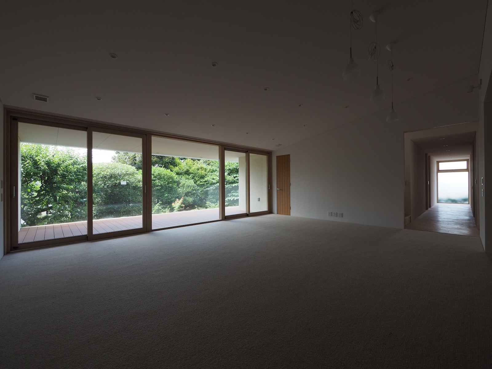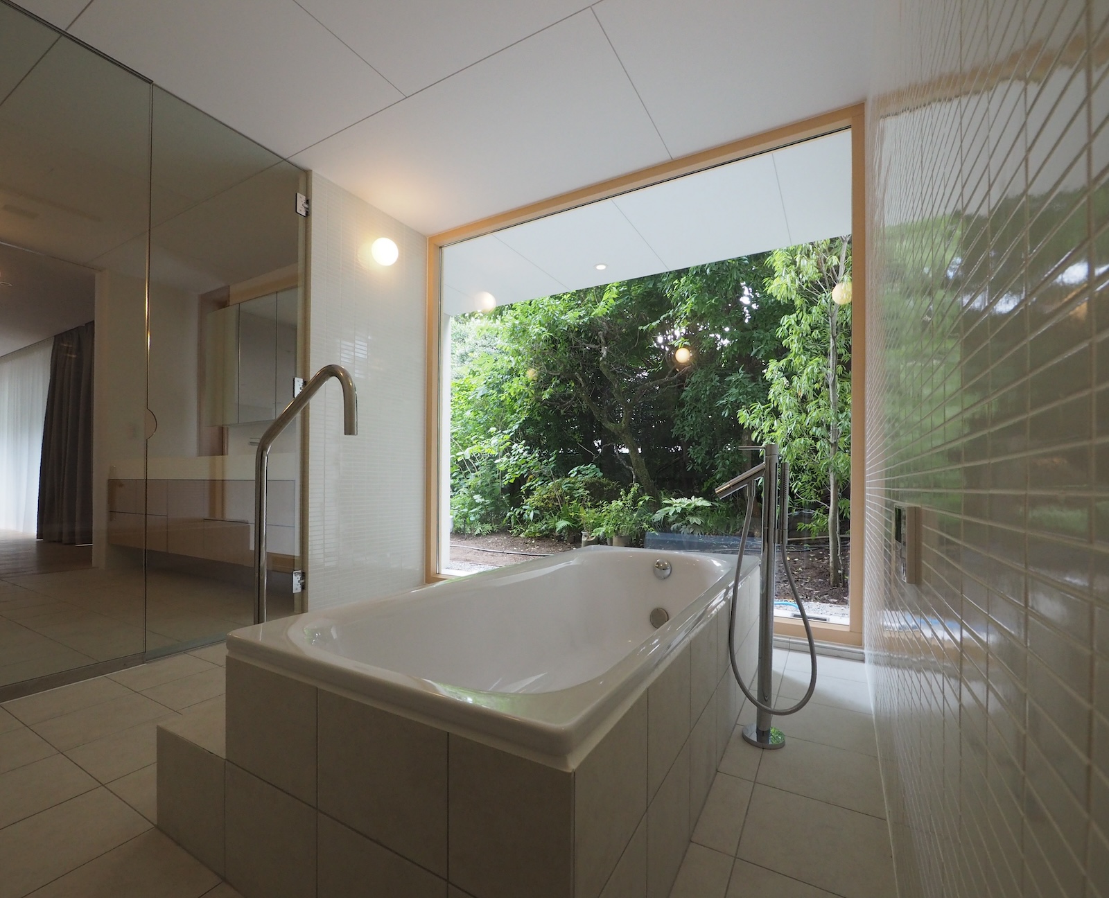 建築事例 都心に建つ緑豊かな家 work_14_03 都心の一等地にありながら恵まれた緑を部屋いっぱいに取入れた空間を望まれ、これを実現する配置としています。 中でも特殊なご要望だったのは、海外の雑誌でご覧になった金物を一切使用しない強化ガラスの手摺。ここばかりは施工者を含め念入りな打ち合わせを必要としました。 大きな浴室の真ん中に置かれた浴槽。ここも景色を楽しみつつ普段の日常から切り離された雰囲気を味わえる場所として用意されました。