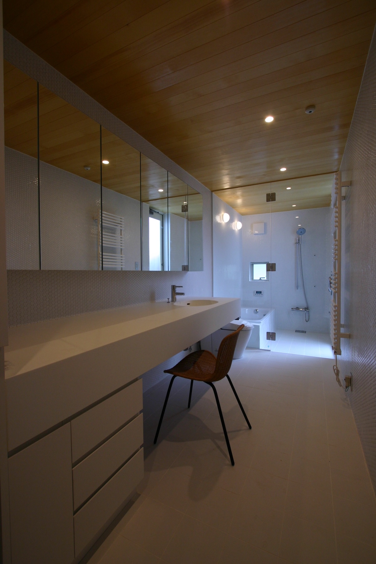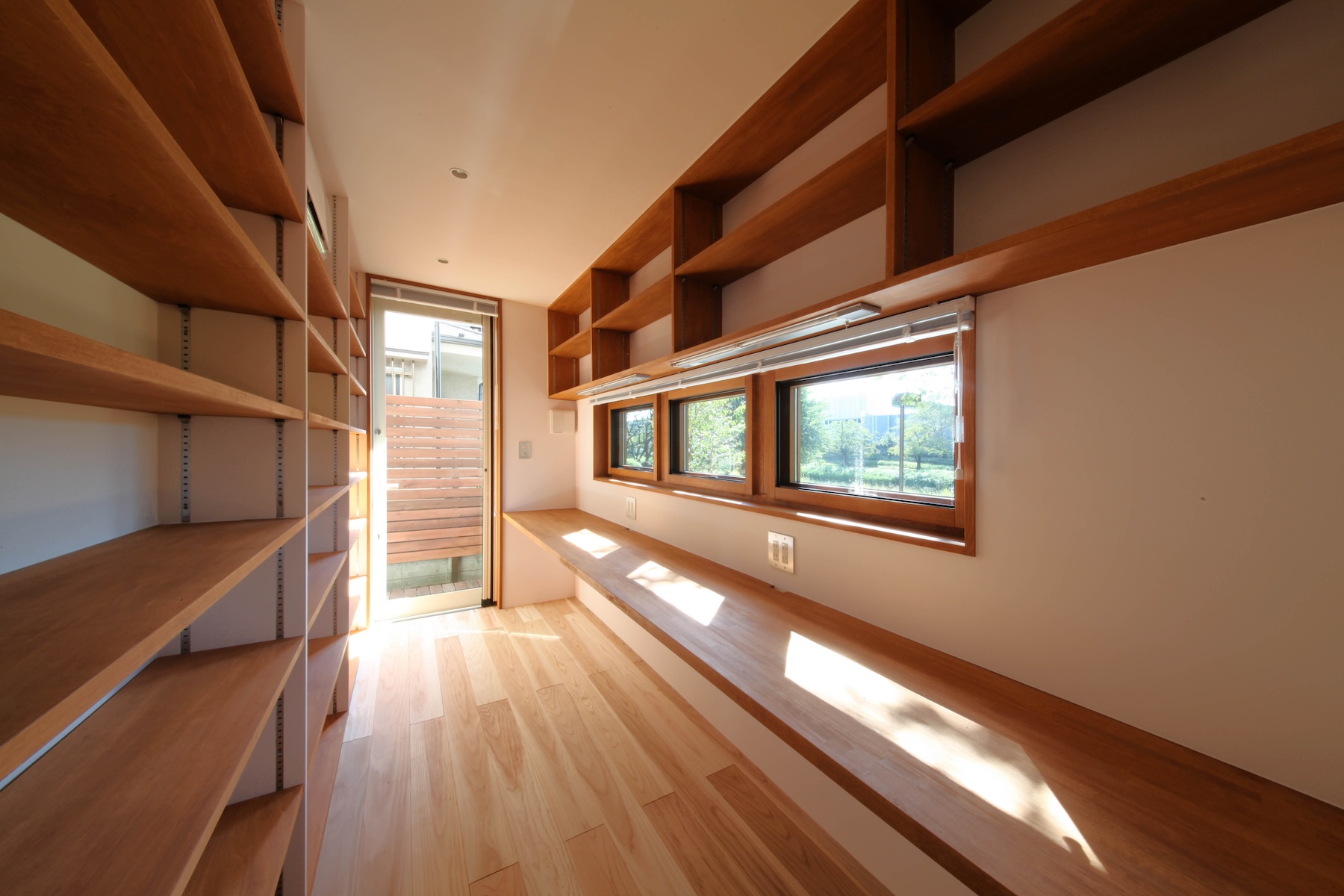 建築事例 市街地に建つ内部空間に拘った家 work_15_02work_15_03work_15_01 家族全員が使える書斎スペース。子供たちの成長に合わせてここを使う人数も本棚に並ぶ本も、そして机の占有領域も徐々に変わっていく。 隣地や周辺環境との関係から地窓を設けて視線を緑だけに集中させることがあるけれど、障子からの仄かな光が低い位置に入ってくるのも趣深いものがある。 洗面所から浴室にかけて白を基調としてまとめたいという要望は多いが、写真の様に天井や椅子などで木を使うといっぺんに雰囲気が柔らかくなる。