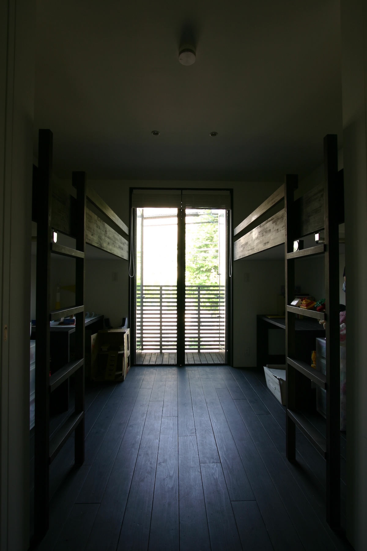 内法が3.2mしかない子供部屋を将来二つに分けられるようにという計画。ベッドの下に勉強机と本棚、クロゼットが付いている。