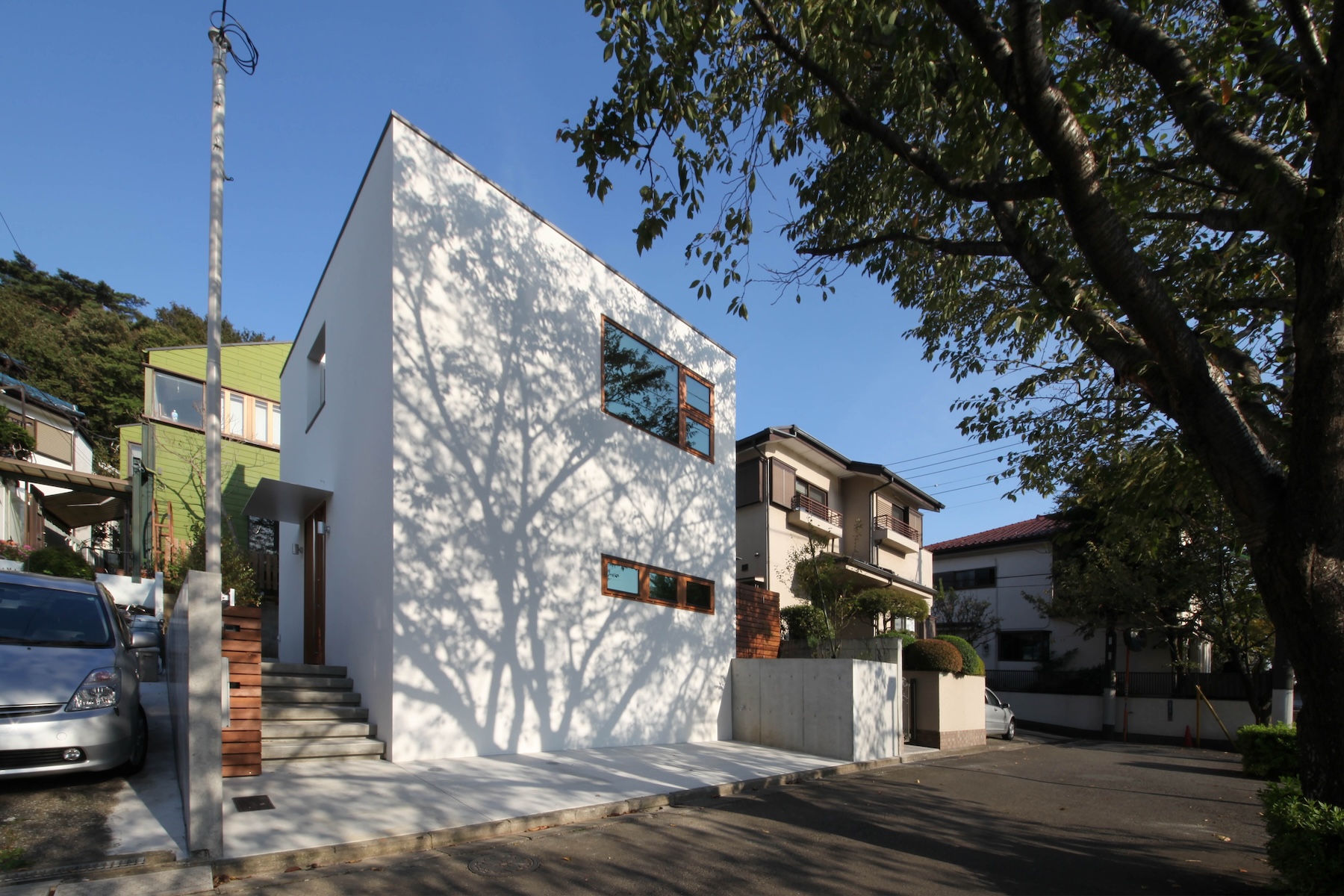 小川沿いに見事な桜並木が並んでいるので、夕方になると白い壁面に桜のシルエットがくっきりと映し出される。