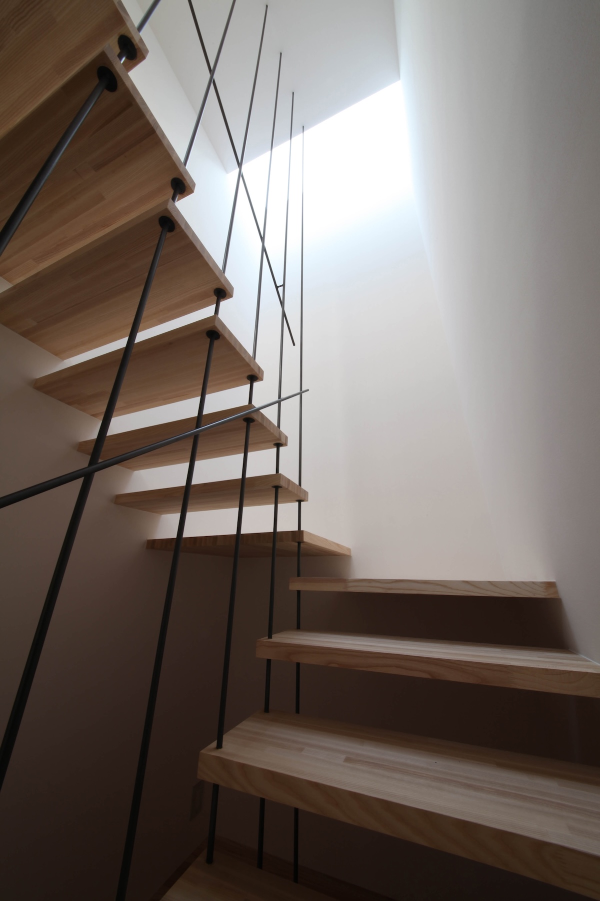 リビングと同じ川に面する階段室は天窓だけを付けて、いつでも空が見えている。段板の中央寄りは天井の中の構造材から吊られているので、見た目よりもしっかりとしていて揺れも殆ど無い。