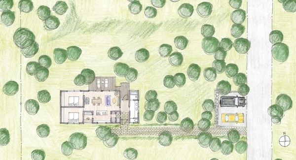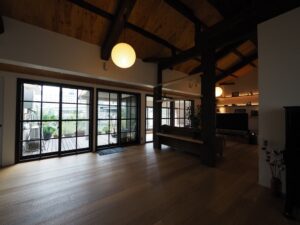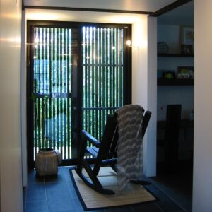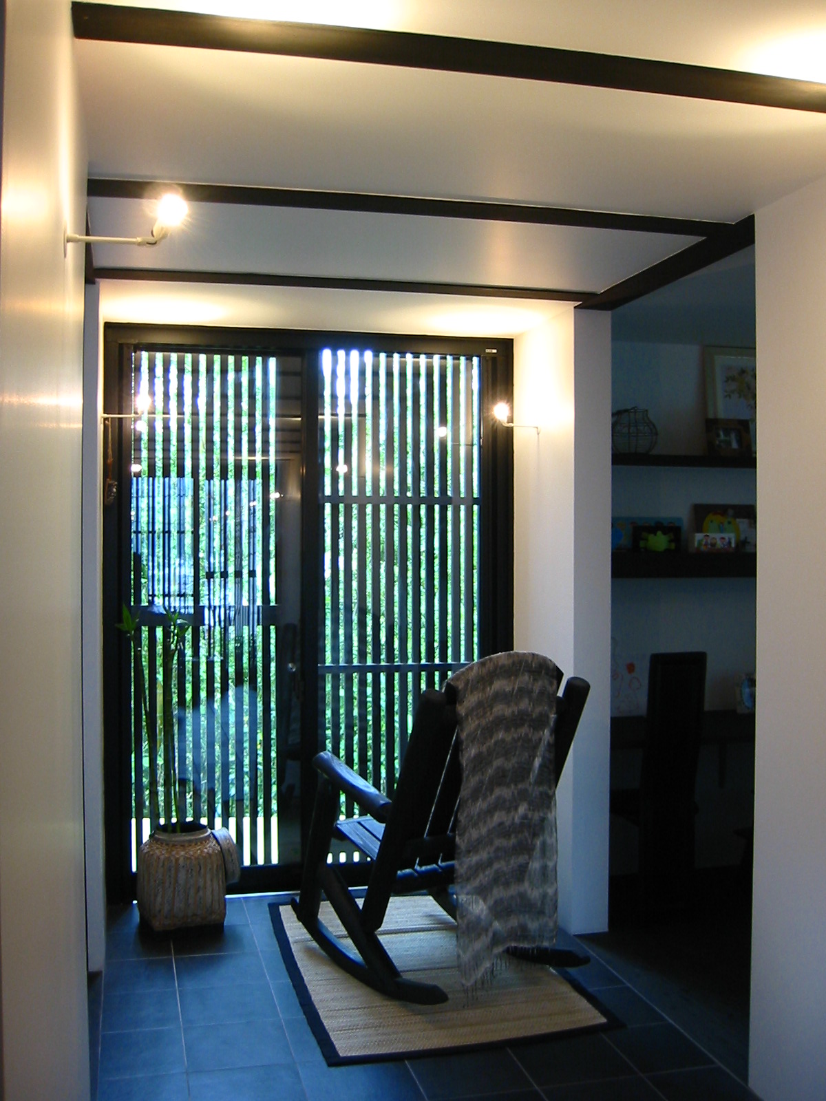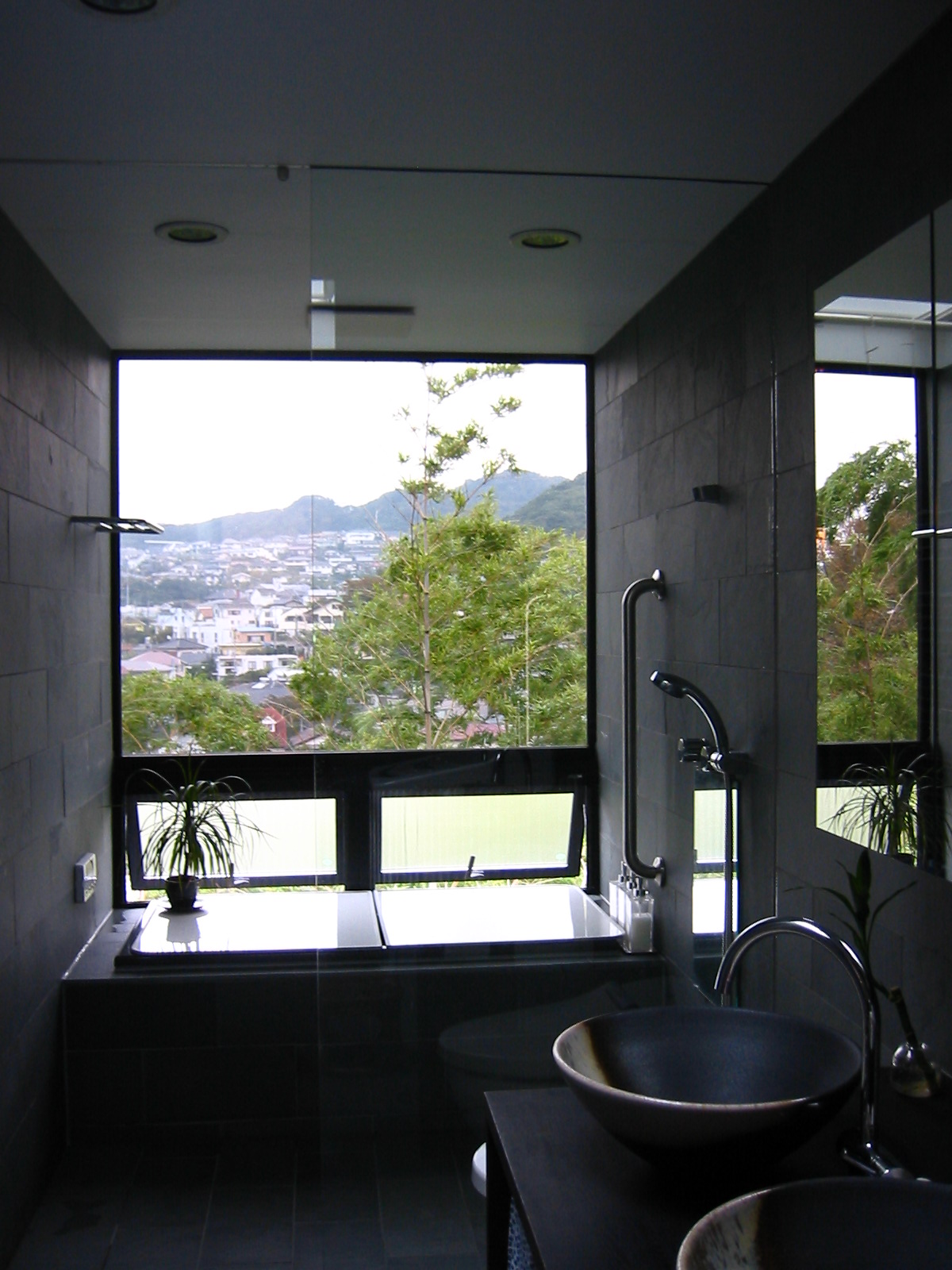 建築事例 通り土間のある家 work_21_02work_21_01 玄関を入ってそのまま家を通り抜けた先にある格子付きの窓。 小高い丘の稜線上に建っているため2階の浴室からの見晴らしは素晴らしい。浴室内の照明を落として目の前の竹藪を照らす外部照明を灯すことで夜も人目を気にせず風呂を楽しむことができる。